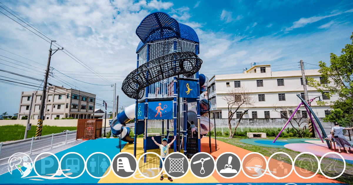 有主題性、共融式、結合在地文化與特色,已是新興公園的基本條件。所以即便是老公園,若新增的遊具新穎有特色,甚至加入在地文化元素,依舊能帶入新的一波熱潮,彰化景觀公園就是很好的一個例子。彰化的鐵道文化耳熟能詳,扇形車站更是許多朋友都去過的景點,彰化景觀公園新增的遊戲場便是以扇形車站為設計主軸,將地方文化特色融入孩子們最喜歡的遊具中。