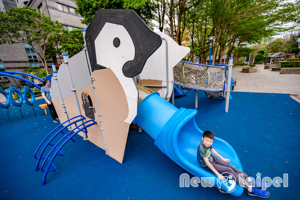 ▼在企鵝遊戲場體驗完畢,接著來到靠近一號出口,2025四月正式啟用的鯨魚遊戲場。【備註:從企鵝遊戲場經過市民活動中心,在到鯨魚遊戲場需過一條小馬路(重慶路245巷50弄),因為有車子進出,所以過馬路要特別小心,注意安全喔!】