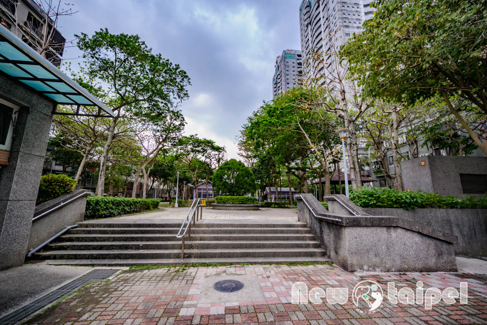▼狹長的重慶公園包含前、後兩座遊戲場,中段則是有樹木環抱的休憩廣場以及市民活動中心。
