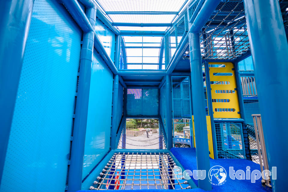 ▼大鯨魚主體塔結合兩道滑梯,想玩短道滑梯可以走樓梯或利用攀岩牆、鑽籠方式。鯨魚肚子裡設計不同攀爬介面與路線,加強孩子們手腳並用外還能訓練平衡感。