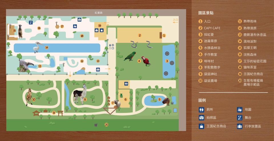 ▼循著指示牌的方向前進,即可到達戶外各動物區,有:袋鼠農場區、羊駝散步區和水豚森林浴。