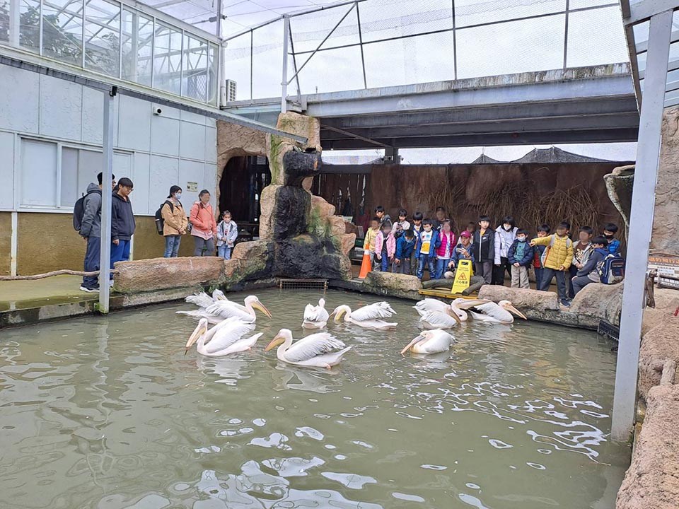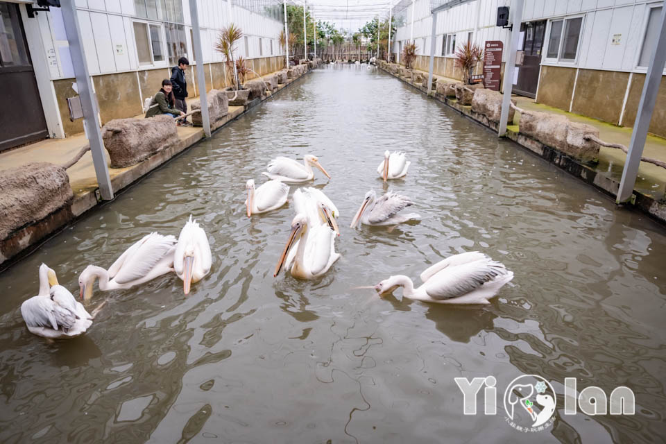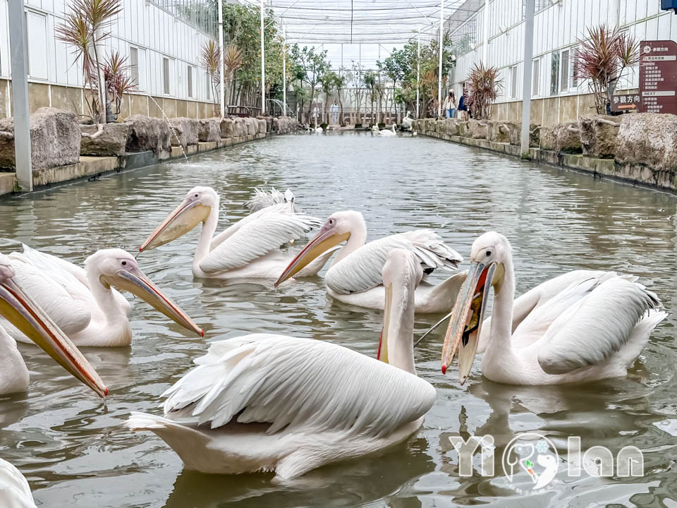 ▼濕地派對區規劃直長的水道,讓鵜鶘飛行秀的可看性更高,飛行秀每日兩場:11:10、 15:00 (若有變動依園區公告時間為主)。巨大喉囊是牠們的特徵,加上時不時在水裡東翻西找,大嘴一開一閉的畫面很有趣,不少朋友都開啟錄影模式。