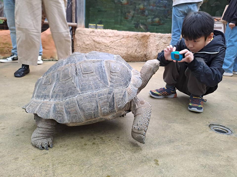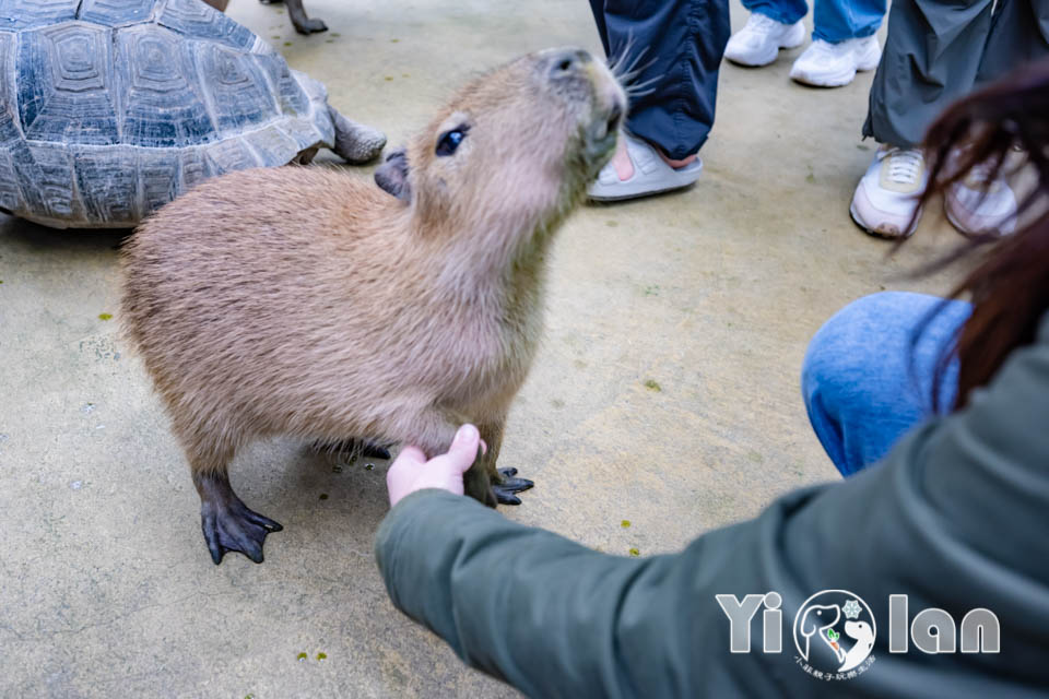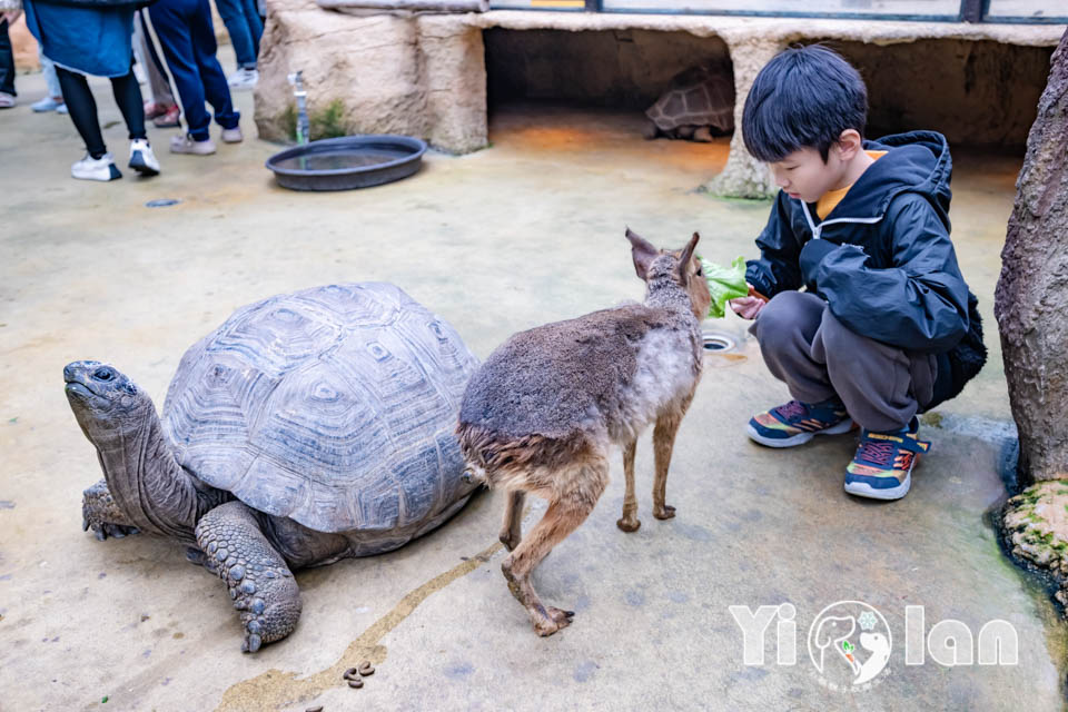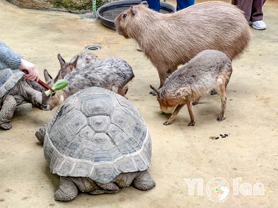 ▼接下來進入到熱帶雨林與熱帶濕原,蘇卡達象龜和水豚君等動物齊聚一堂,這裡的動物不僅可以互動,還能餵食。互動的時候要溫柔對待喔!